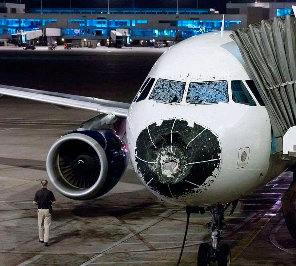 Aeronave de American Airlines alcanzada por una granizada, se observan severos daños en el radomo y rotura de ambos parabrisas