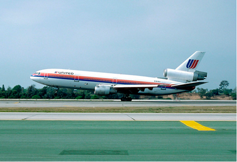 Foto del DC-10 de United minutos antes del intento de aterrizaje, en ella se advierten la falta del cono de cola y daños en el estabilizador horizontal.